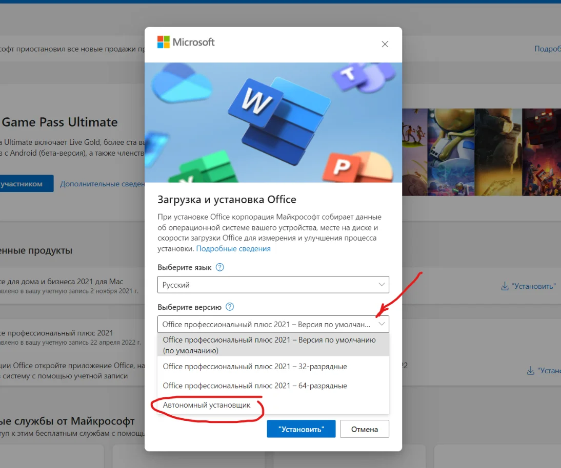 Данная проблема часто возникает при установке Office, скачанного из личного кабинета. Проблема в том, что вы, скорее всего, скачали онлайн установщик. В данный момент, в связи с различными ограничениями западных кампаний, установка данным способом недоступна для жителей России и Беларуси. Но решение данной проблемы очень простое — вам необходимо скачать Автономный установщик. Автономный установщик это полная версия Офиса, который вы сразу скачиваете себе на компьютер для установки. В процессе установки он не загружает дополнительные файлы.